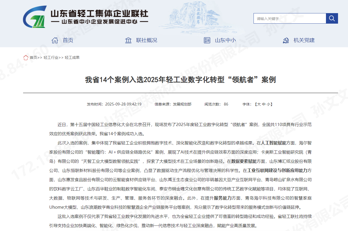 近日,第十五届中国轻工业信息化大会在北京隆重召开,会上正式发布了2025年中国轻工业数字化转型“领航者”案例名单。在全国范围内评选出的110项具有行业示范效应的优秀案例中,山东恒联新材料股份有限公司(简称“公司”,下同)凭借其优秀的数字化转型实践成功入选。